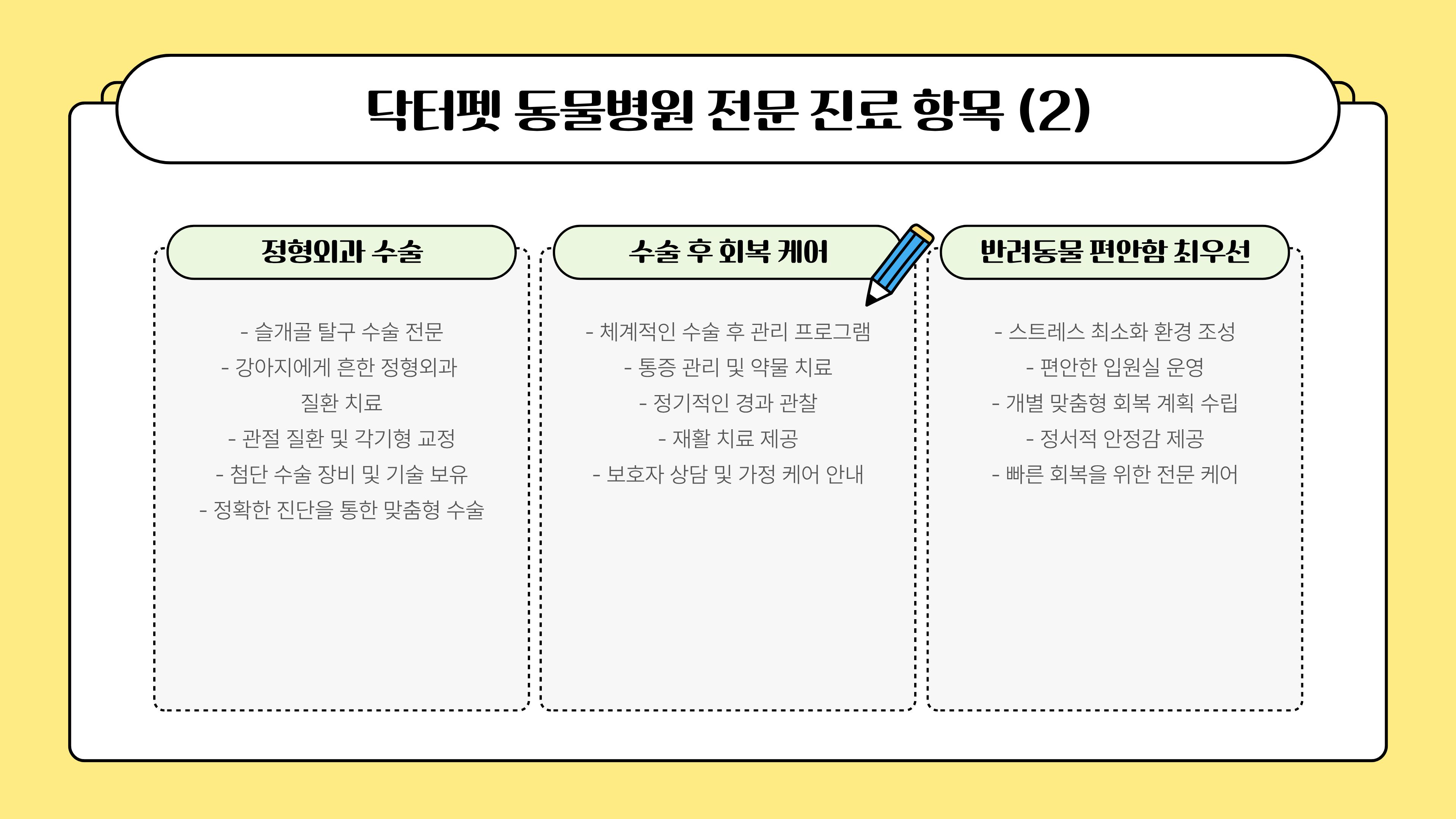 수술 후 회복까지 세심하게 케어해드리며, 반려동물의 편안함을 최우선으로 생각합니다.
