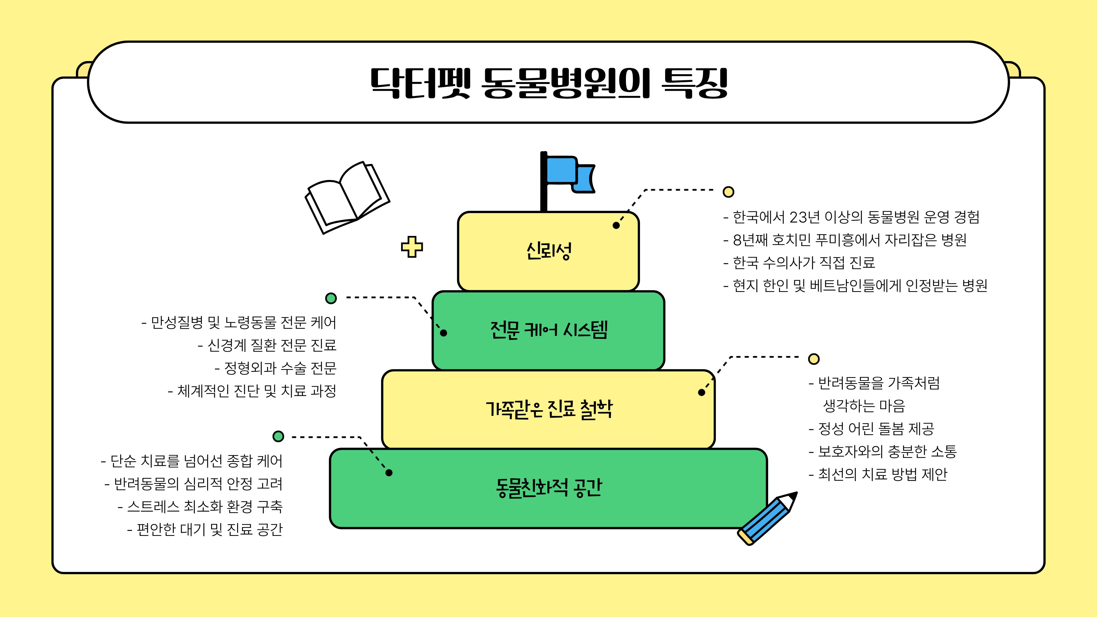 닥터펫은 24시간 응급실 운영은 물론, 전문적인 진료와 정성 어린 케어로 현지 한인 커뮤니티는 물론 베트남 현지인들에게도 많은 사랑을 받고 있는 동물병원입니다.