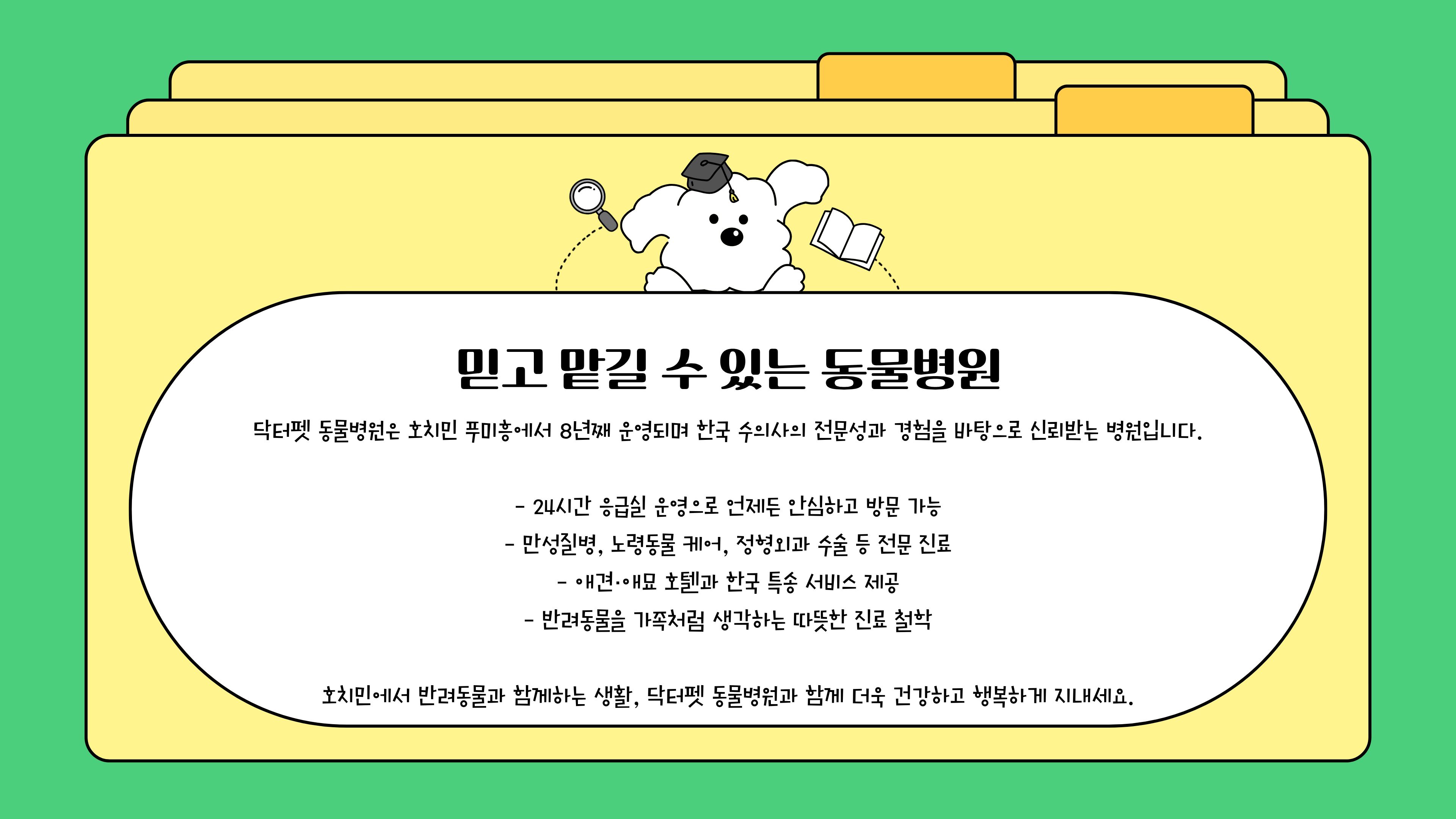 닥터펫은 24시간 응급 진료가 가능한 호치민 동물병원으로, 언제든지 믿고 맡기실 수 있습니다.