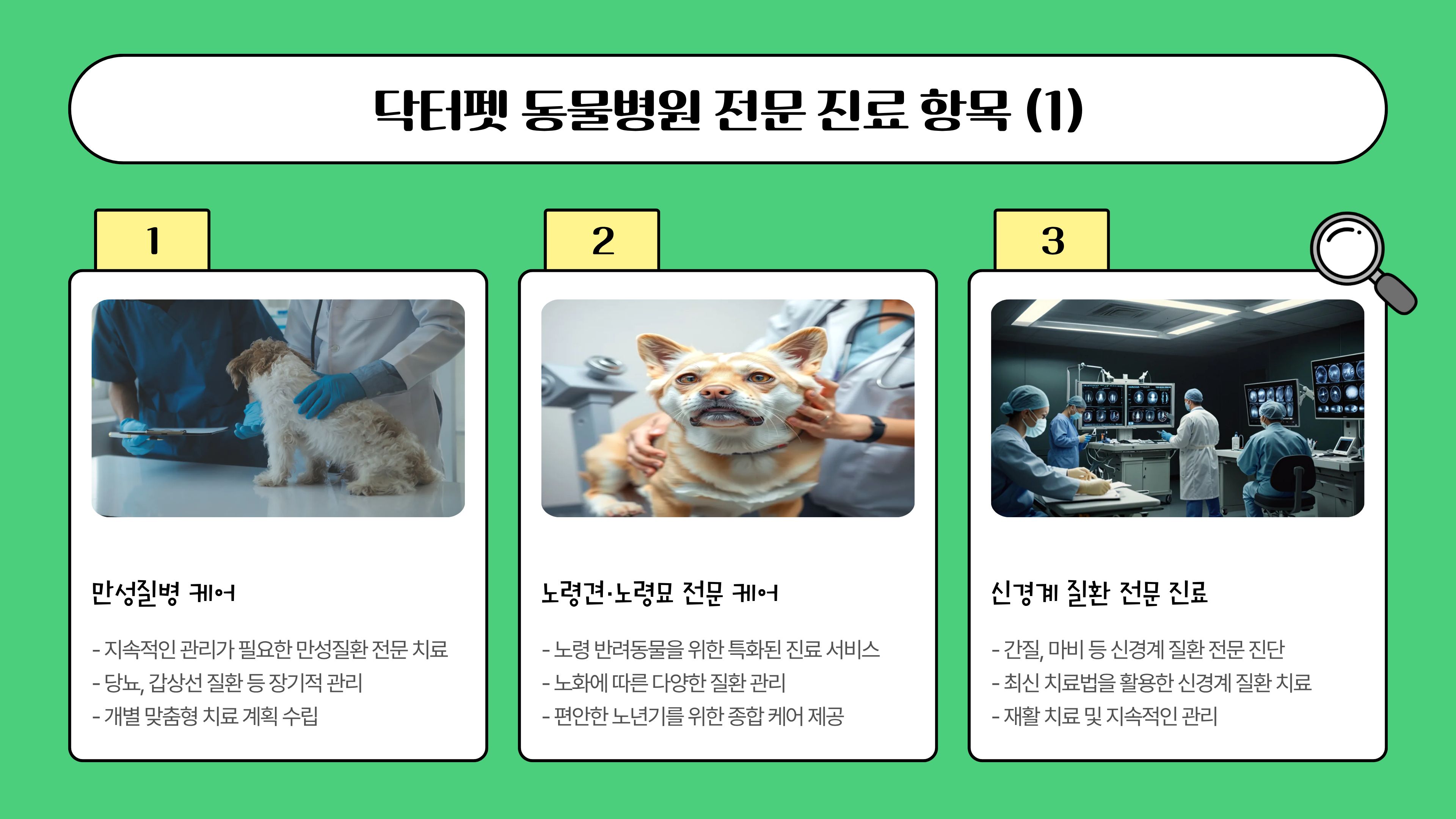 닥터펫은 특히 만성질병 및 노령견·노령묘 케어, 그리고 신경계 질환, 슬개골 탈구 등 정형외과 수술 분야에 전문성을 가지고 있습니다.