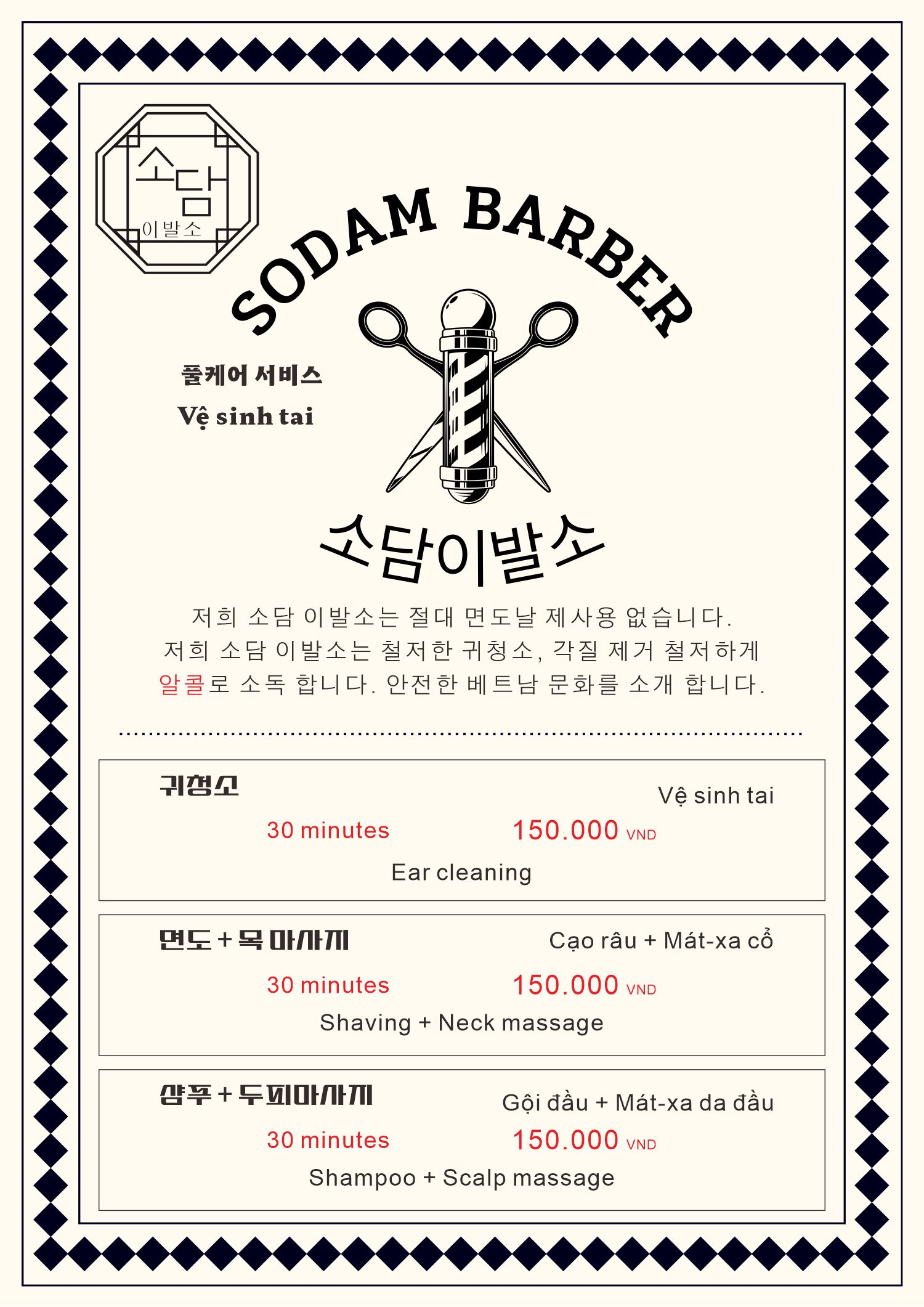 소담이발소에서는 150,000 VND으로 받을 수 있는 실속 있는 풀케어 서비스를 제공합니다. 가격 대비 만족도가 높은 서비스로 이미 많은 단골 고객들이 꾸준히 이용 중입니다.
